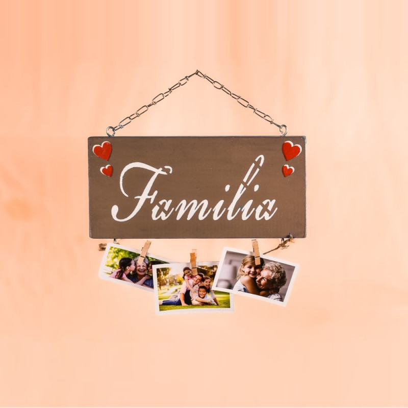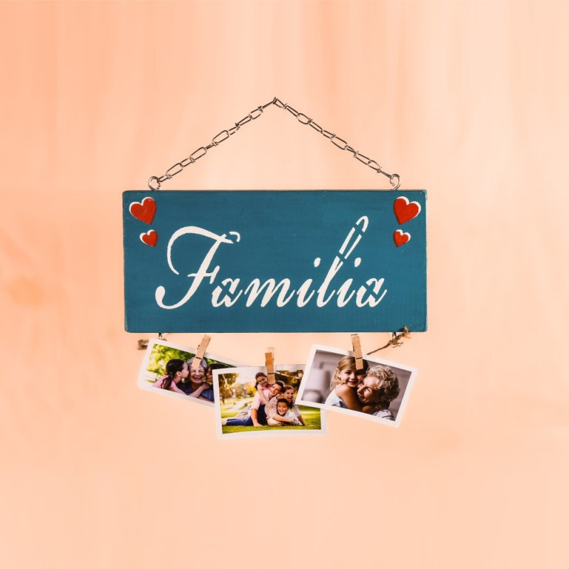 Madera de Pino reforestado, pintado a mano con acrilico tipo pvc, apliques de metal. Colgador de fotos en yute con pincitas sujetadoras. Acabado con barniz transparente protector.