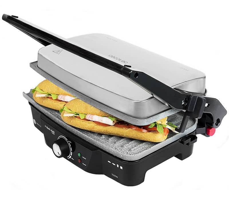 Grill Parrilla eléctrica Contact Grill con 1500 W de potencia y con apertura 180º para aprovechar al máximo la superficie de cocinado. Antiadherencia cerámica con acabado en piedra
