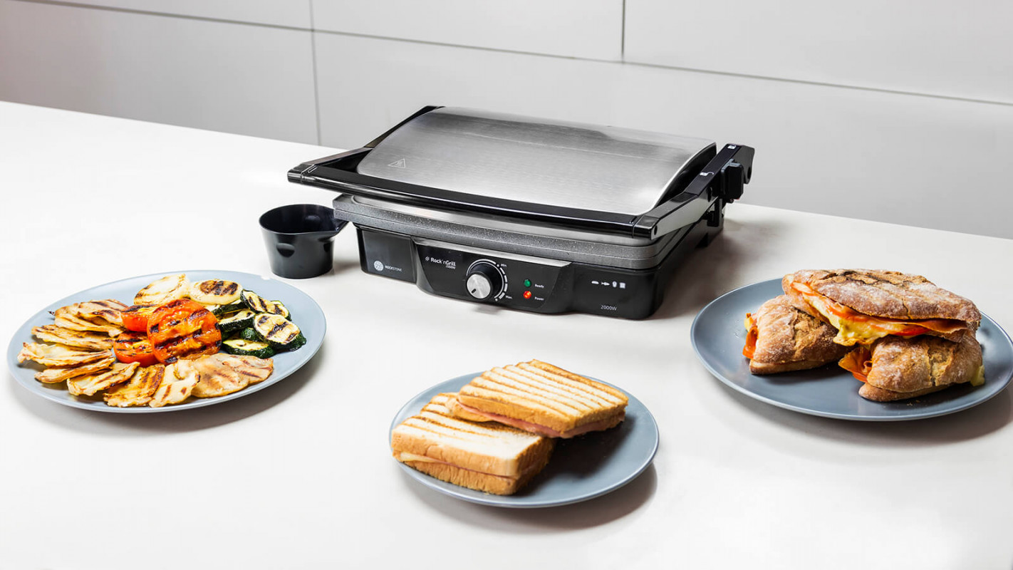 Panini Grill, parrilla eléctrica, plancha y sandwichera con revestimiento de piedra RockStone. 2000W y superficie de 29,7 x 23,5 cm, apertura 180º.
