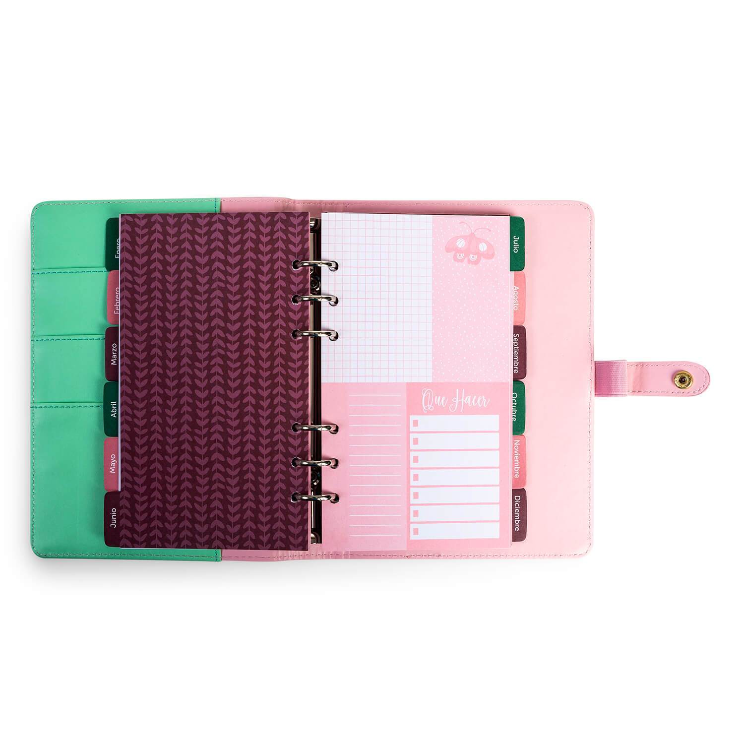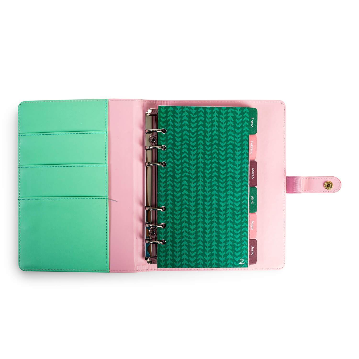Planner Village con broche y tapa de ecocuero con un hermoso diseño de corazón con folia dorada . Contiene un sistema archivador que permite agregar y sacar hojas para organizarte de la mejor manera. Incluye 12 divisores con lindos diseños y 96 página.