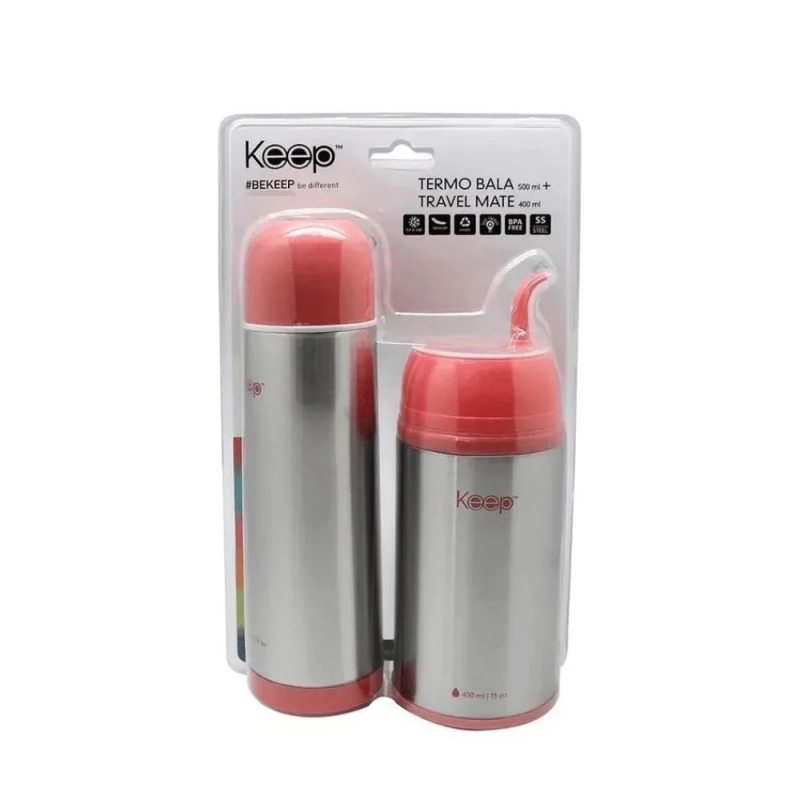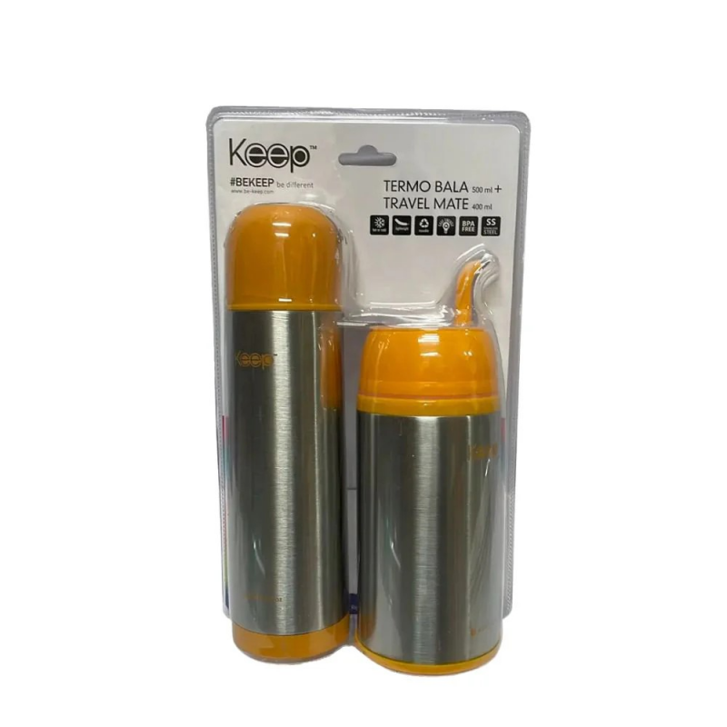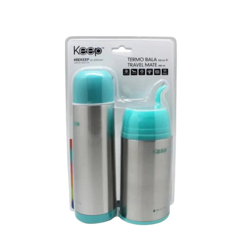Pack que contiene un mate de viaje de acero inoxidable capacidad de 400ml con bombilla y un termo bala con capacidad para 500ml.